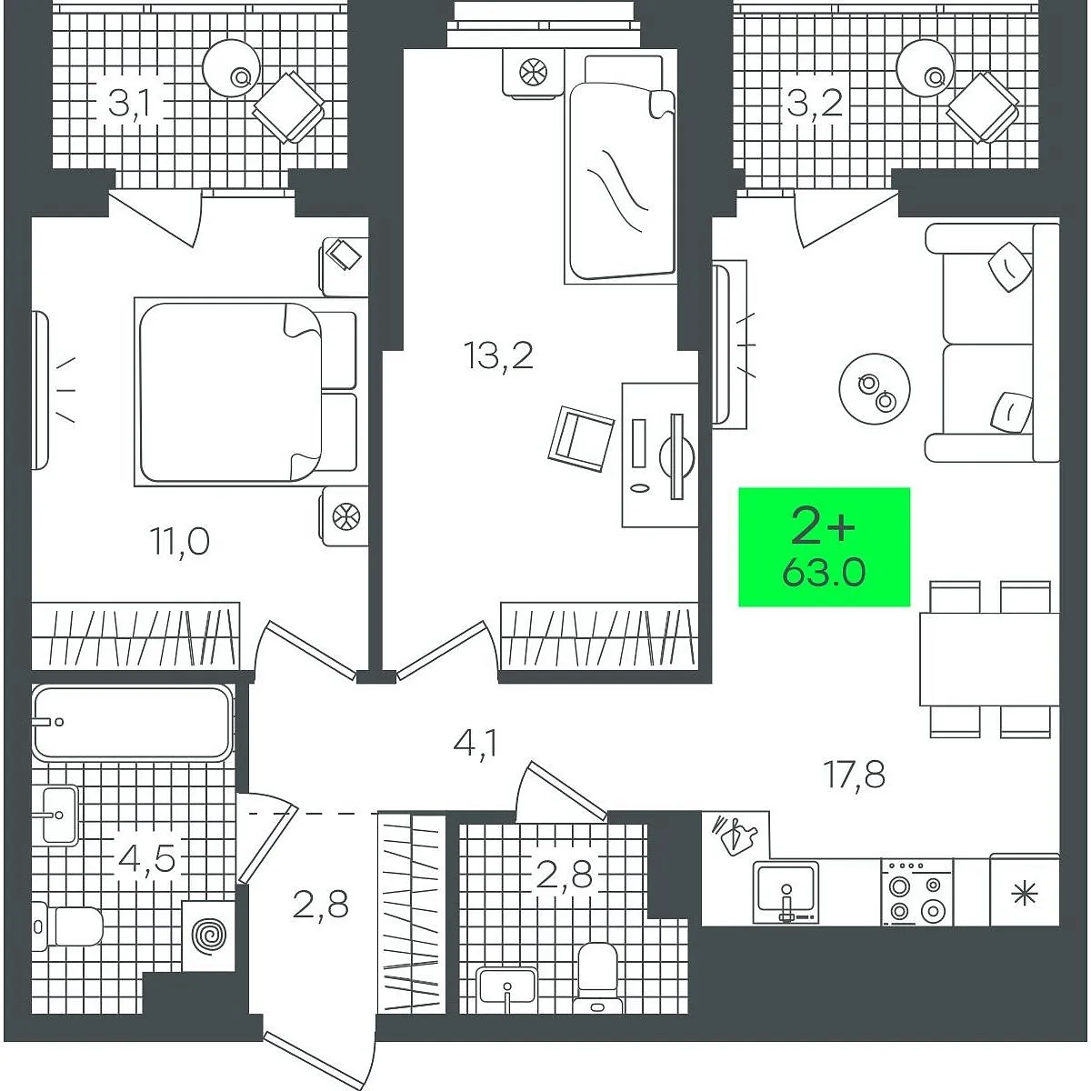 Количество комнат: 2, 63.07 кв.м.
