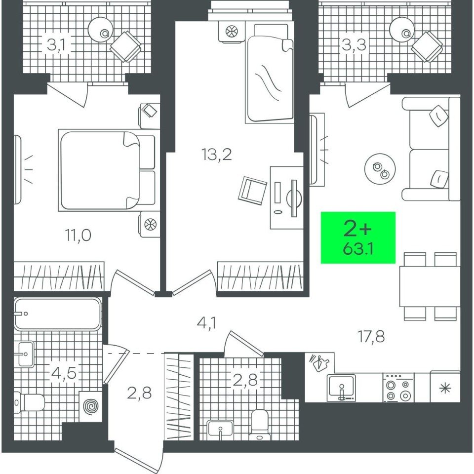 Купить новую двухкомнатную квартиру 63.17 м² на 18/22 этаже в ЖК «Гранд Квартал», г. Тюмень за 8850000 ₽ | Агентство недвижимости «Вплюсе.Топ» — Агентство недвижимости "Вплюсе.Топ"