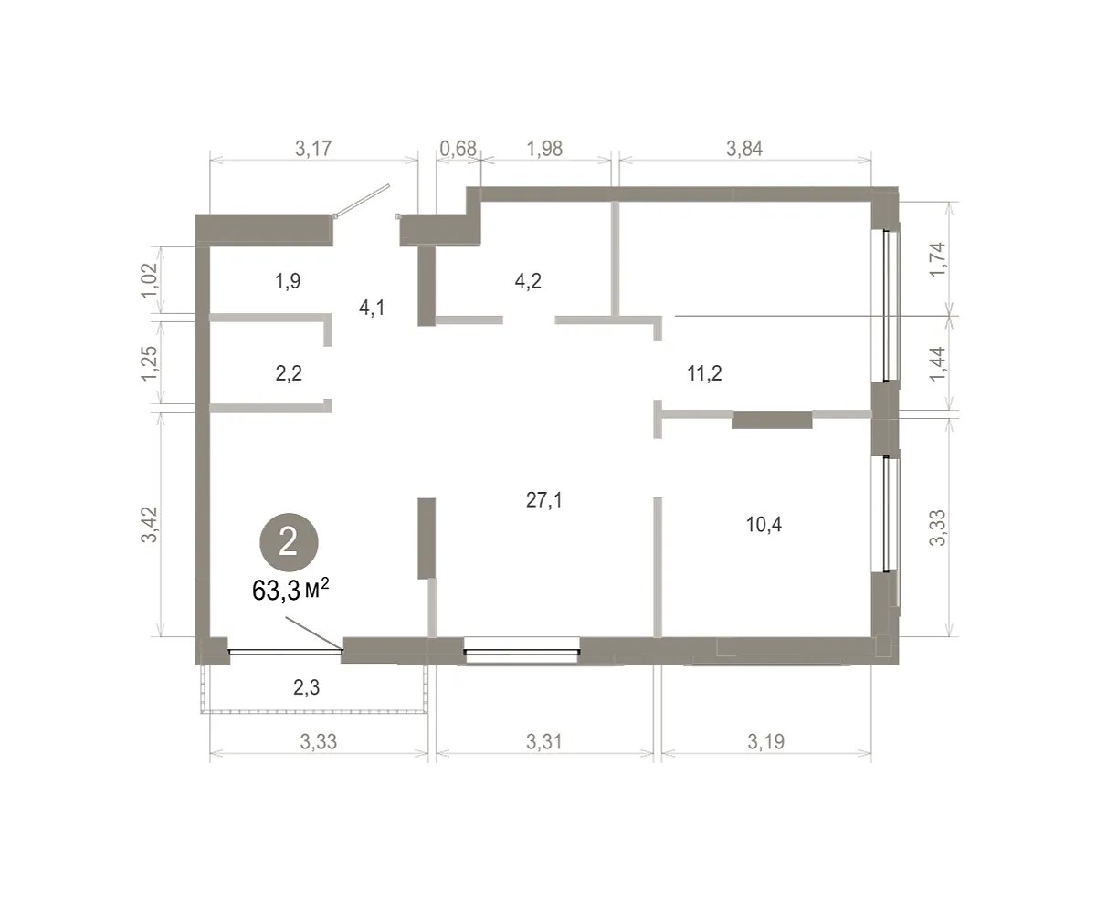 Площадь (общ/жил/кух), м2: 63.33/21.62/27.1