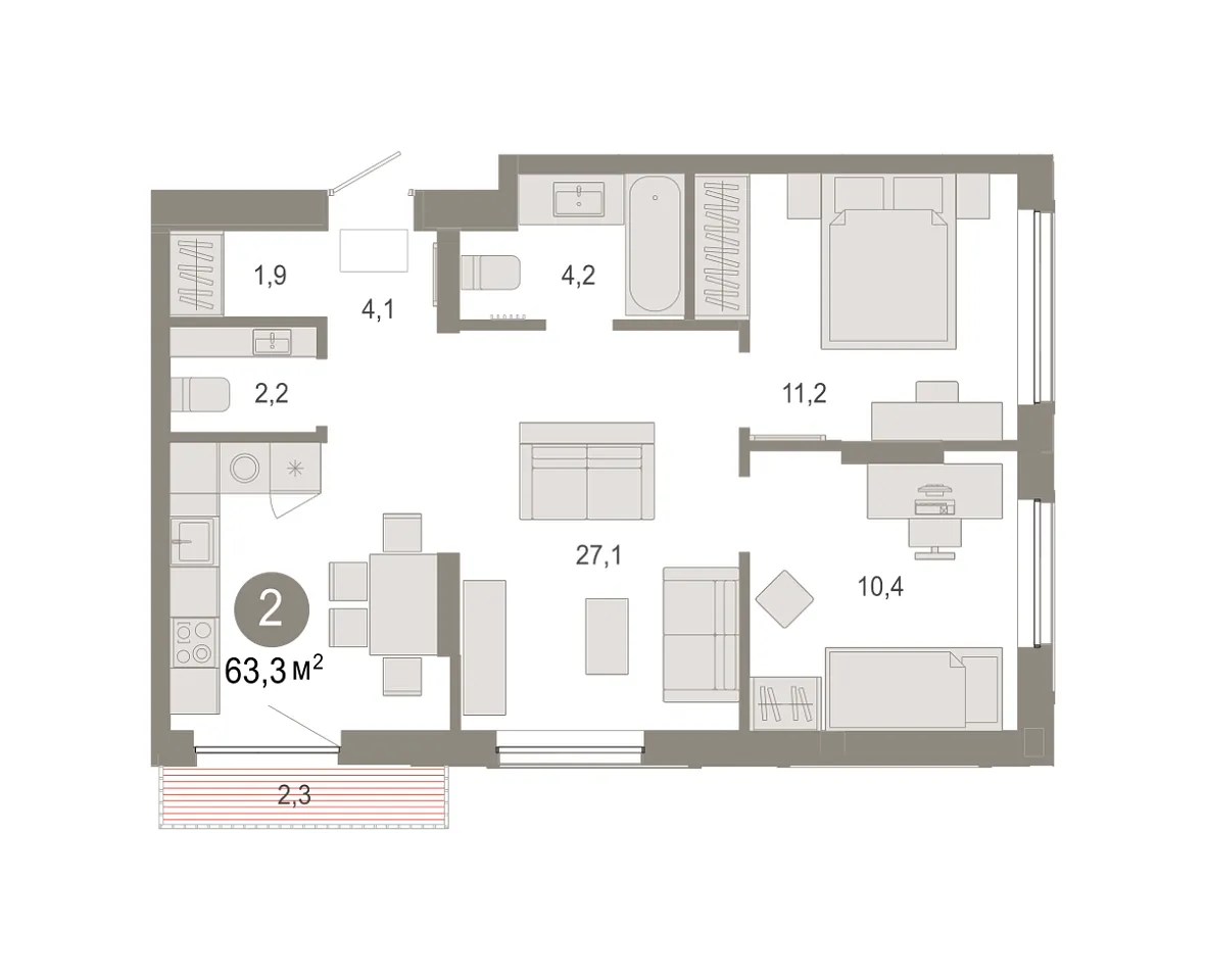 Купить новую двухкомнатную квартиру 63.33 м² на 5/7 этаже в ЖК «Октябрьский на Туре», г. Тюмень за 8910000 ₽ | Агентство недвижимости «Вплюсе.Топ» — Недвижимость России