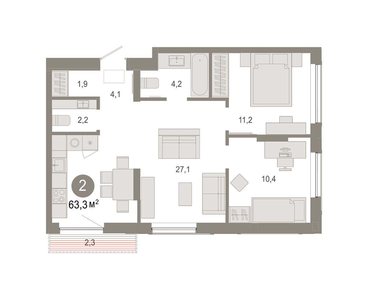 Количество комнат: 2, 63.33 кв.м.