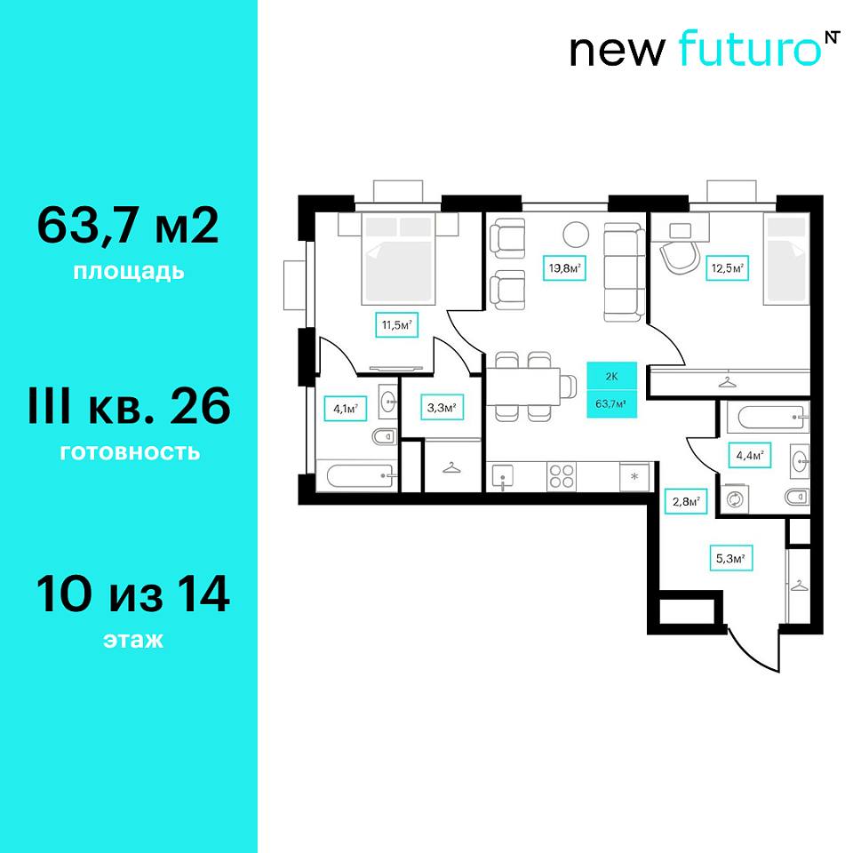 Купить новую двухкомнатную квартиру 63.7 м² на 10/23 этаже в ЖК «Futuro», г. Тюмень за 8955000 ₽ | Агентство недвижимости «Вплюсе.Топ» — Недвижимость России
