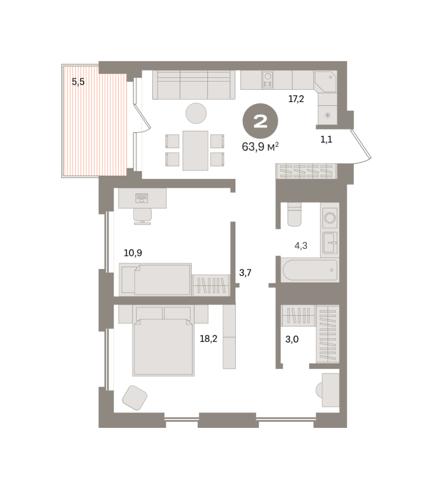 Количество комнат: 2, 63.9 кв.м.