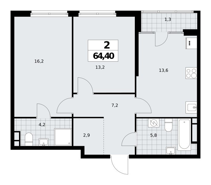 Площадь (общ/жил/кух), м2: 64.4/—/13.6