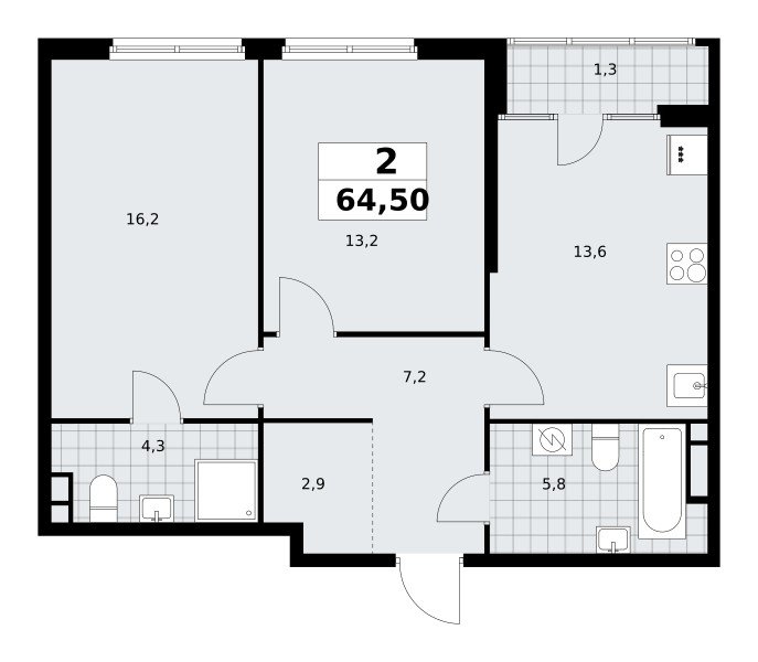 Количество комнат: 2, 64.5 кв.м.