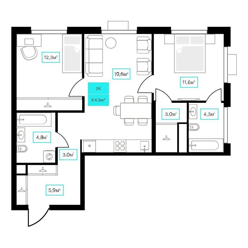 Общая площадь 64.5 м2
