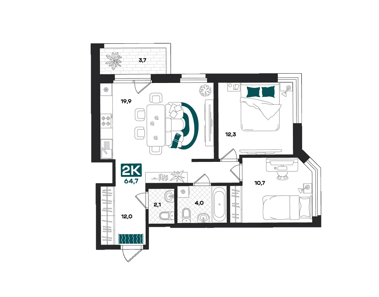 Количество комнат: 2, 64.7 кв.м.