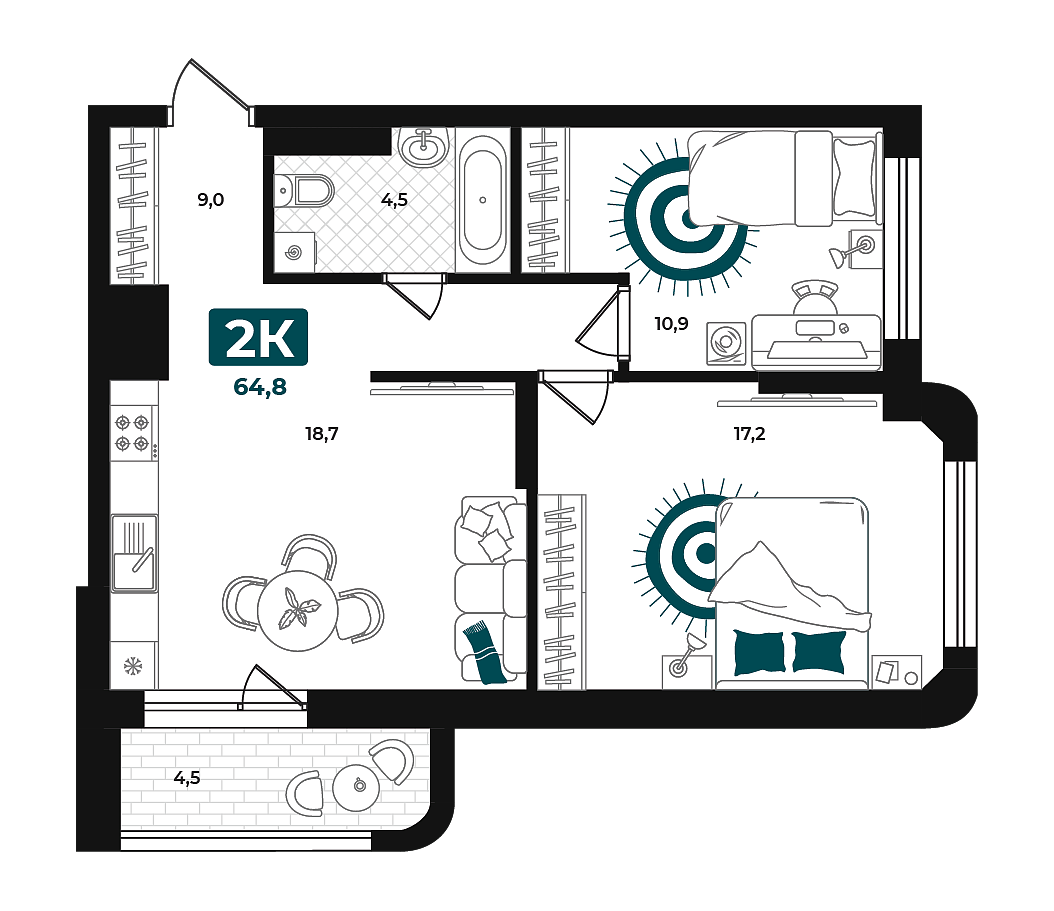 Количество комнат: 2, 64.8 кв.м.