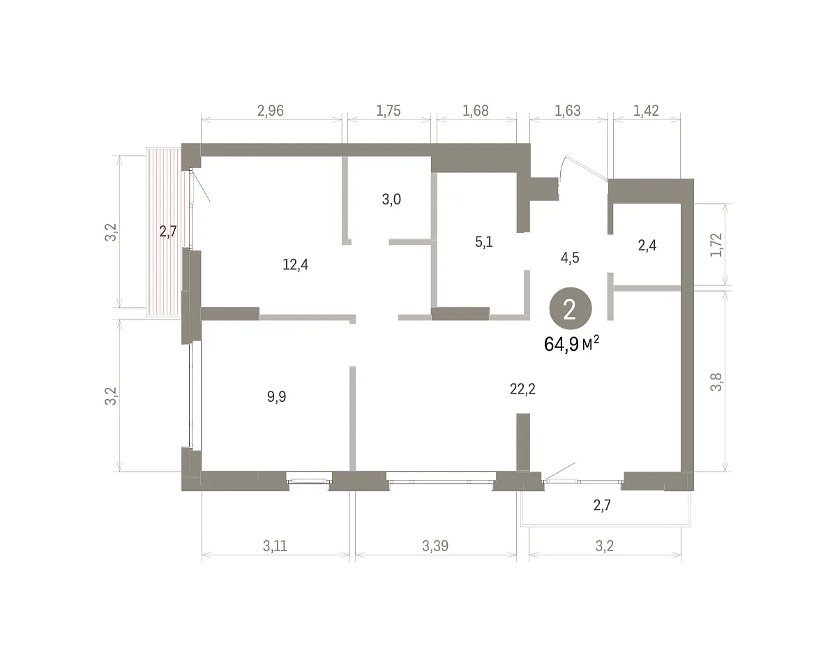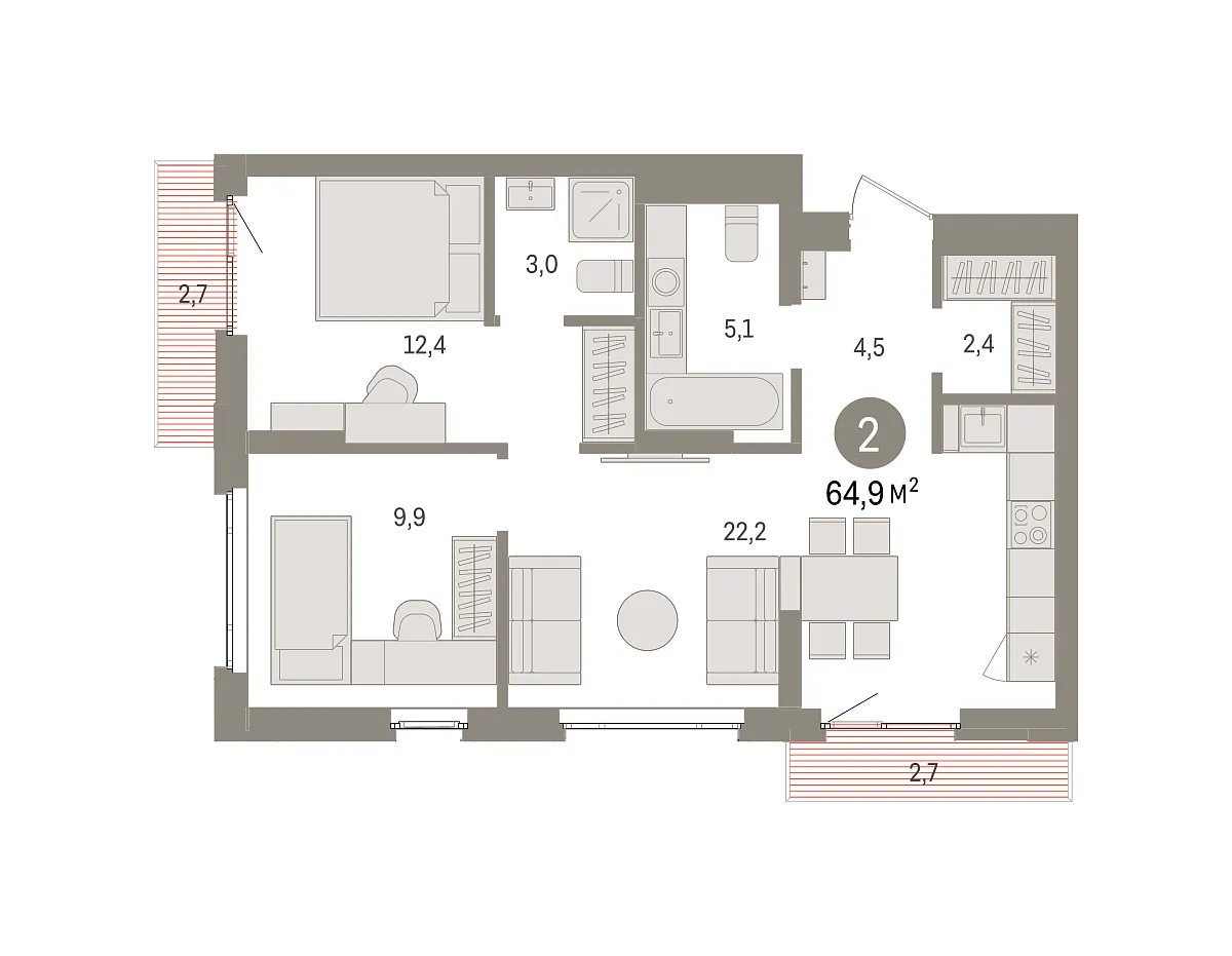 Количество комнат: 2, 64.9 кв.м.