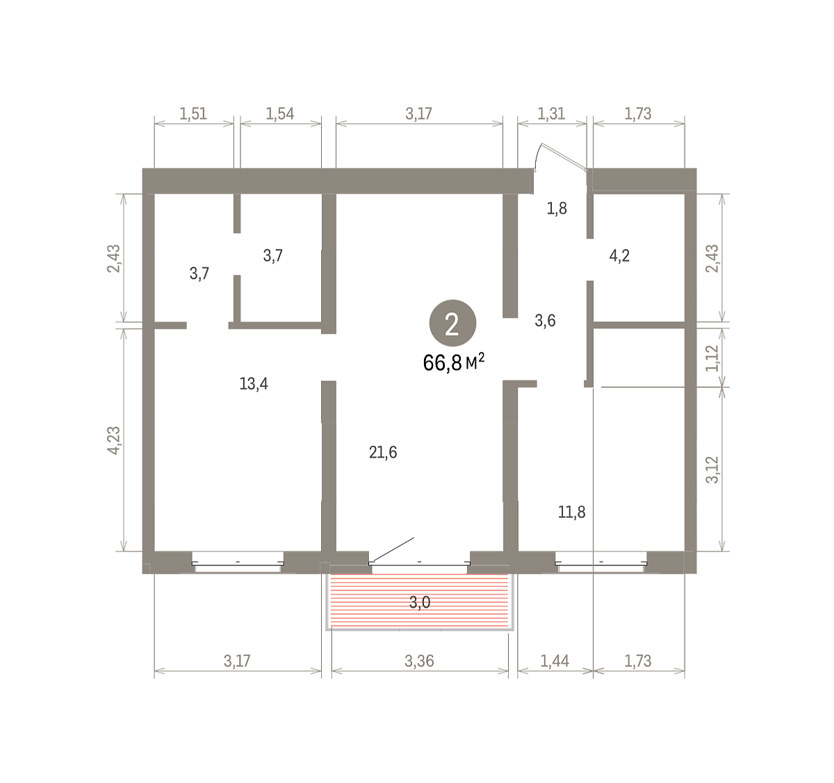Количество комнат: 2, 66.79 кв.м.
