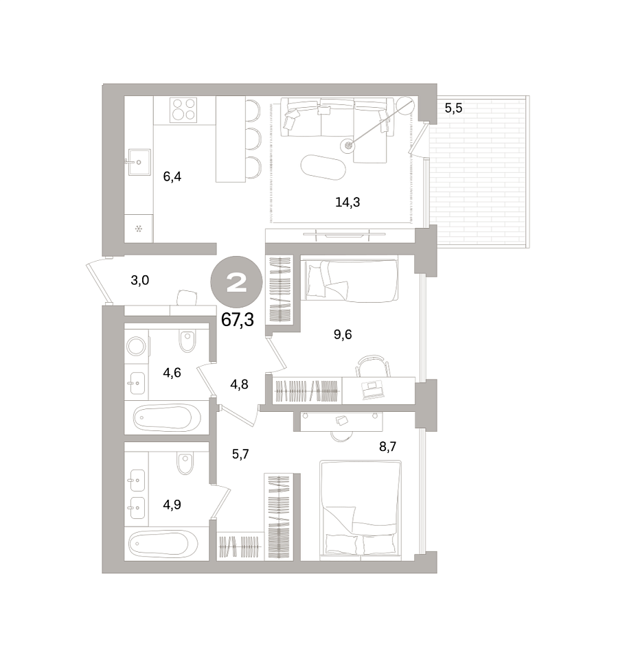 Площадь (общ/жил/кух), м2: 73.3/—/14.3