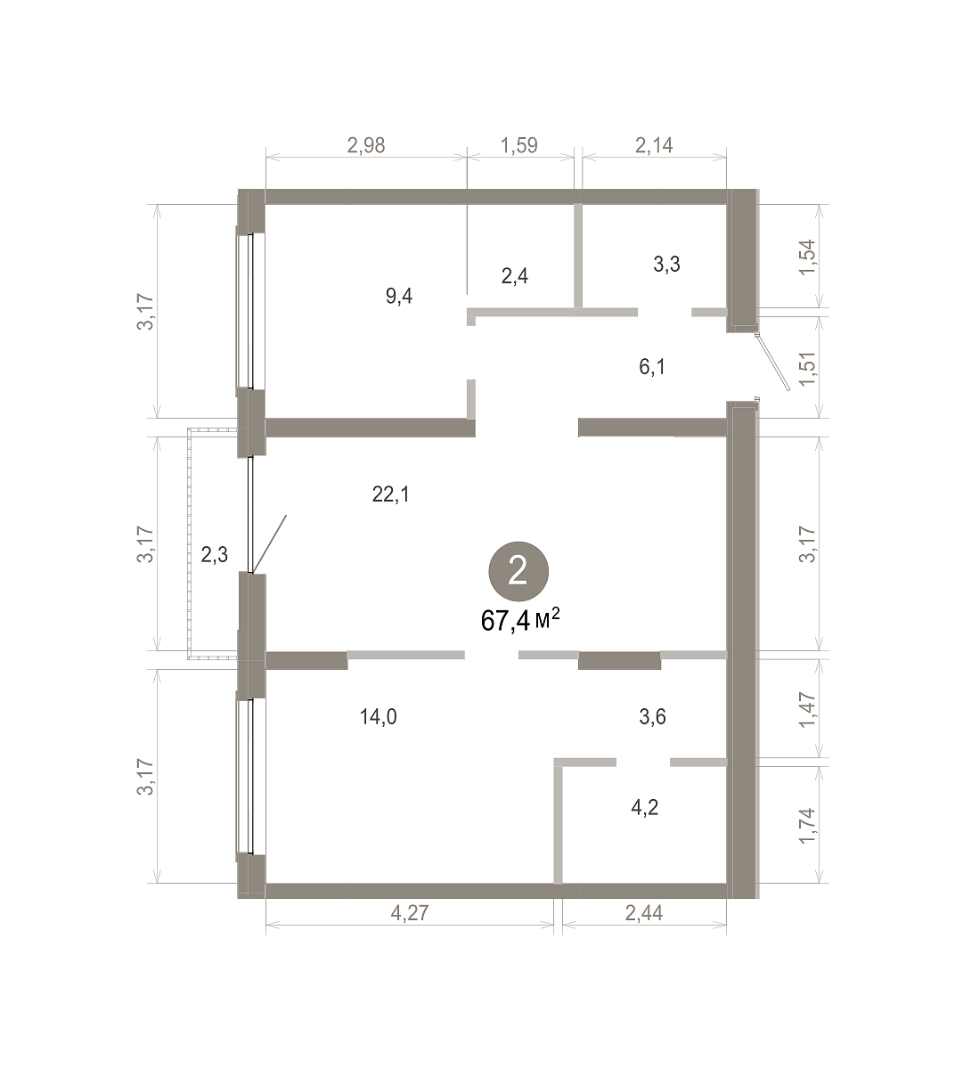 Площадь (общ/жил/кух), м2: 63.68/27.69/21.58