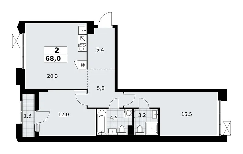 Количество комнат: 2, 68 кв.м.