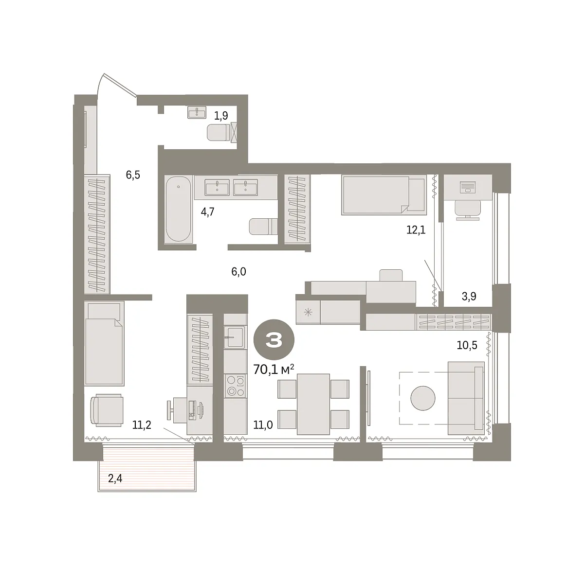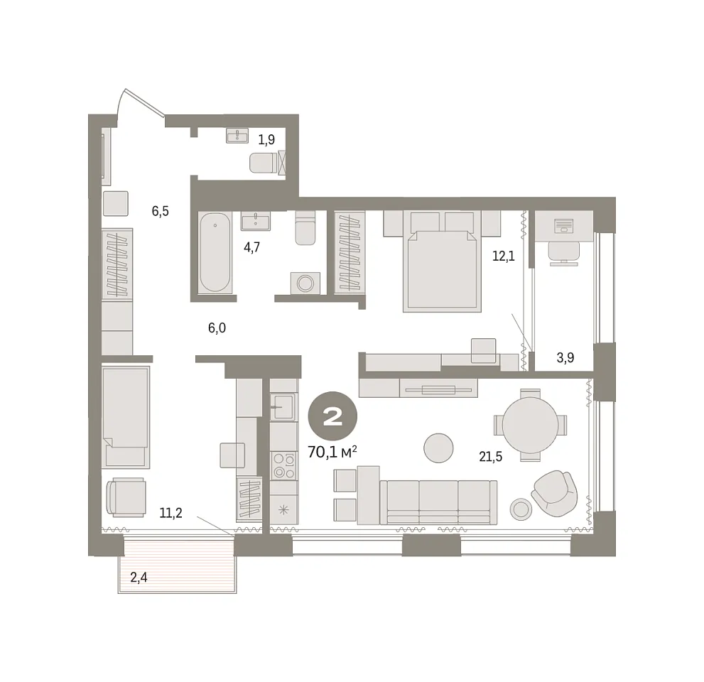 Количество комнат: 2, 70.09 кв.м.