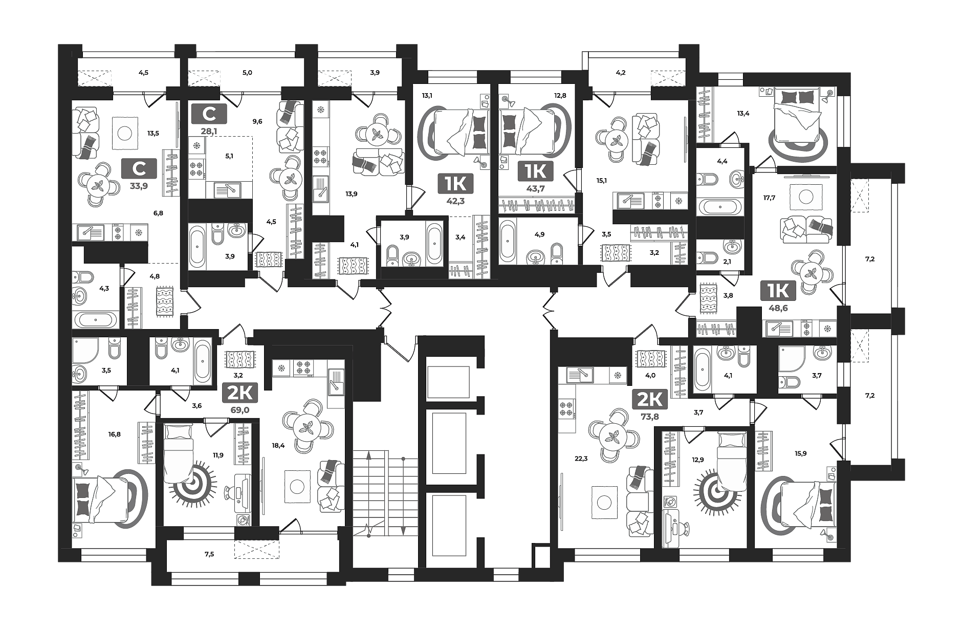 Площадь (общ/жил/кух), м2: 73.9/33.6/—