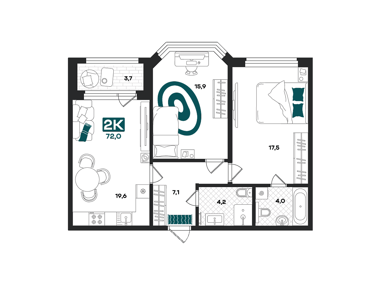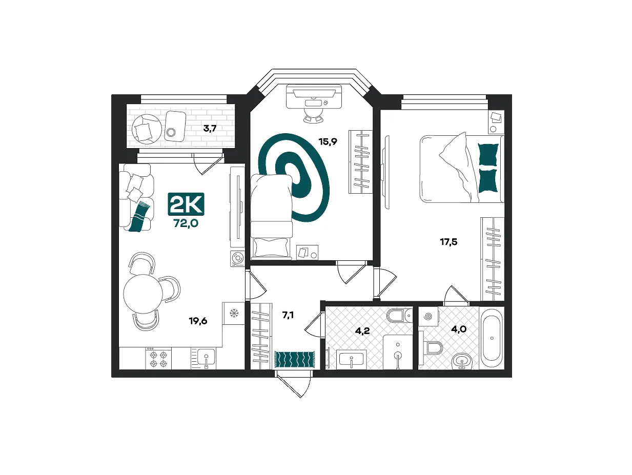 Количество комнат: 2, 72 кв.м.
