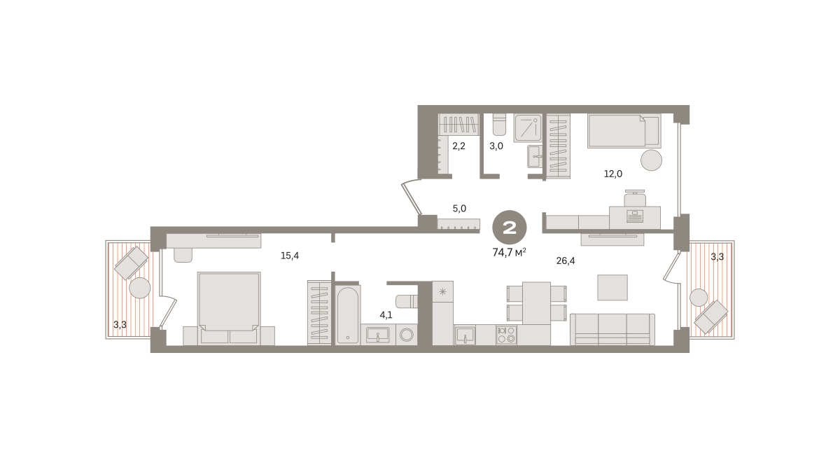 Количество комнат: 2, 74.7 кв.м.