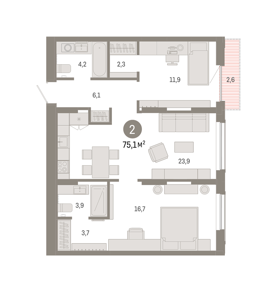 Количество комнат: 2, 75.12 кв.м.