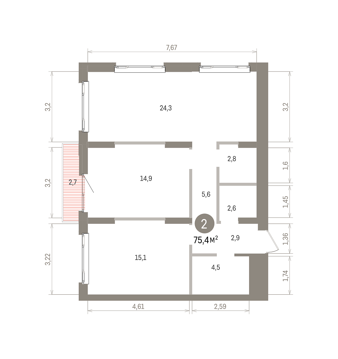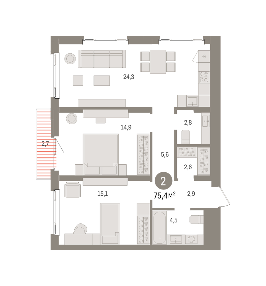 Количество комнат: 2, 75.4 кв.м.
