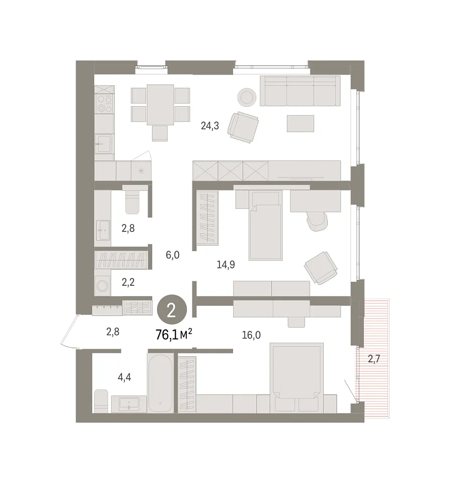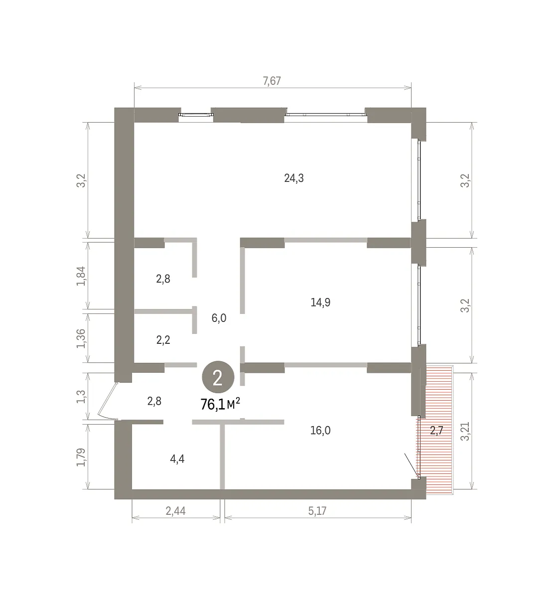 Площадь (общ/жил/кух), м2: 76.1/27.9/24.3