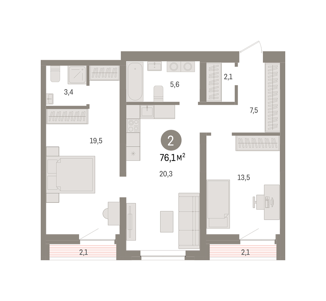 Количество комнат: 2, 76.1 кв.м.