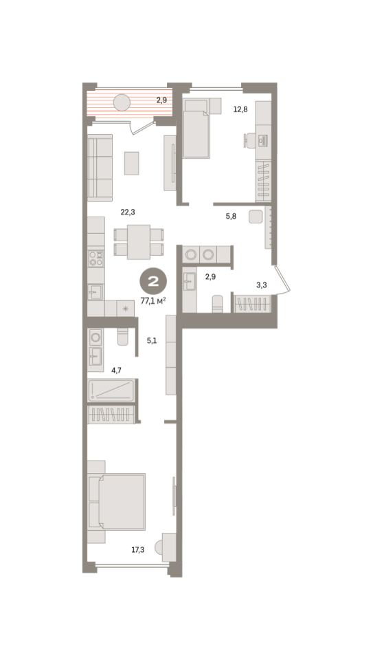 Площадь (общ/жил/кух), м2: 77.1/23.4/22.3