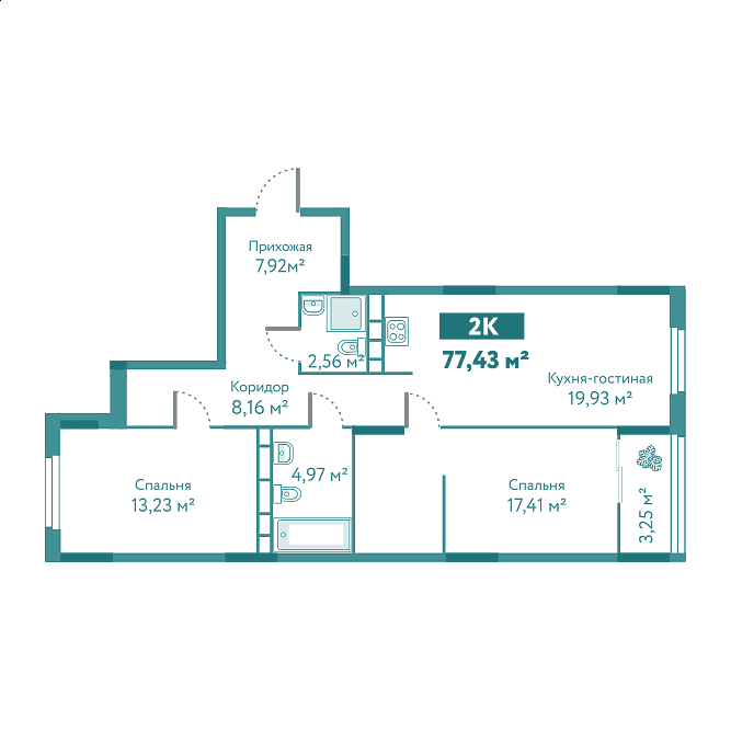 Количество комнат: 2, 77.43 кв.м.