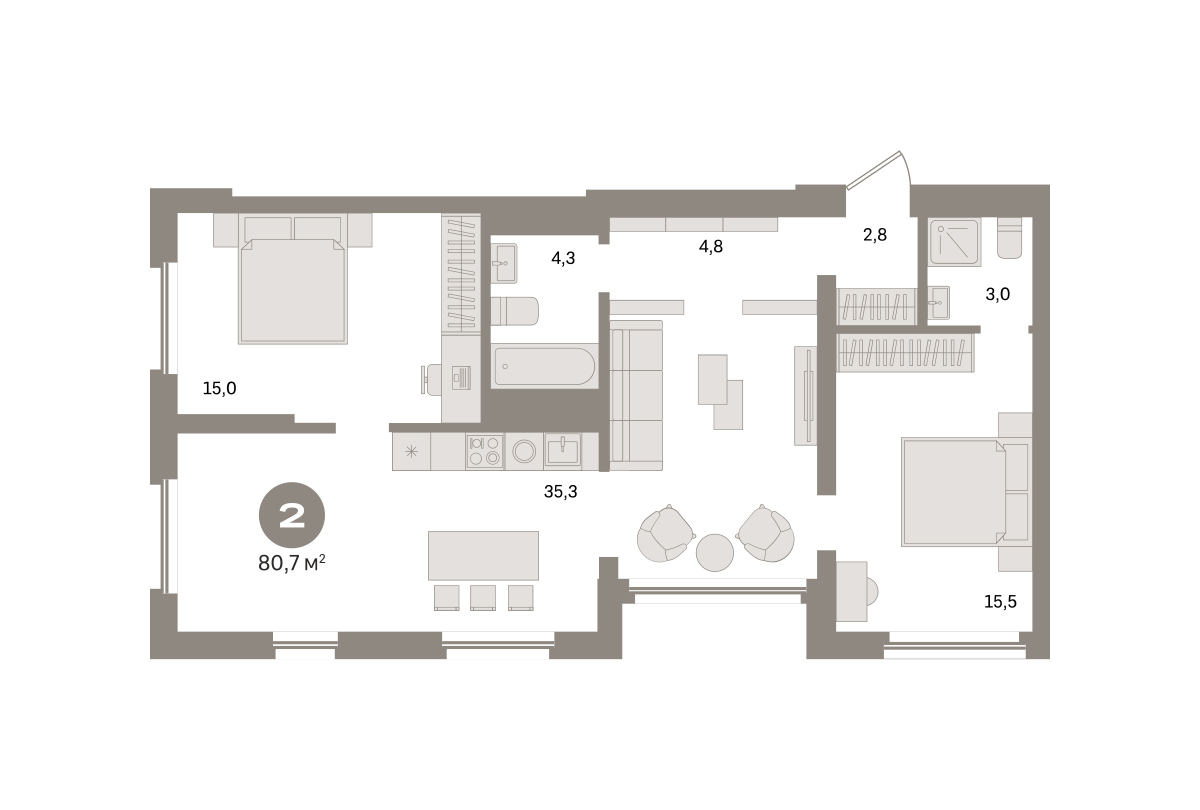 Купить новую двухкомнатную квартиру 80.7 м² на 20/24 этаже в ЖК «Южные кварталы», г. Тюмень за 13890000 ₽ | Агентство недвижимости «Вплюсе.Топ» — Агентство недвижимости "Вплюсе.Топ"