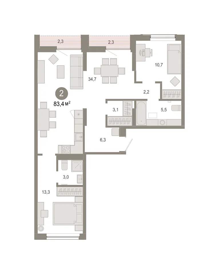 Количество комнат: 2, 83.39 кв.м.