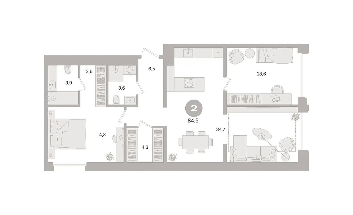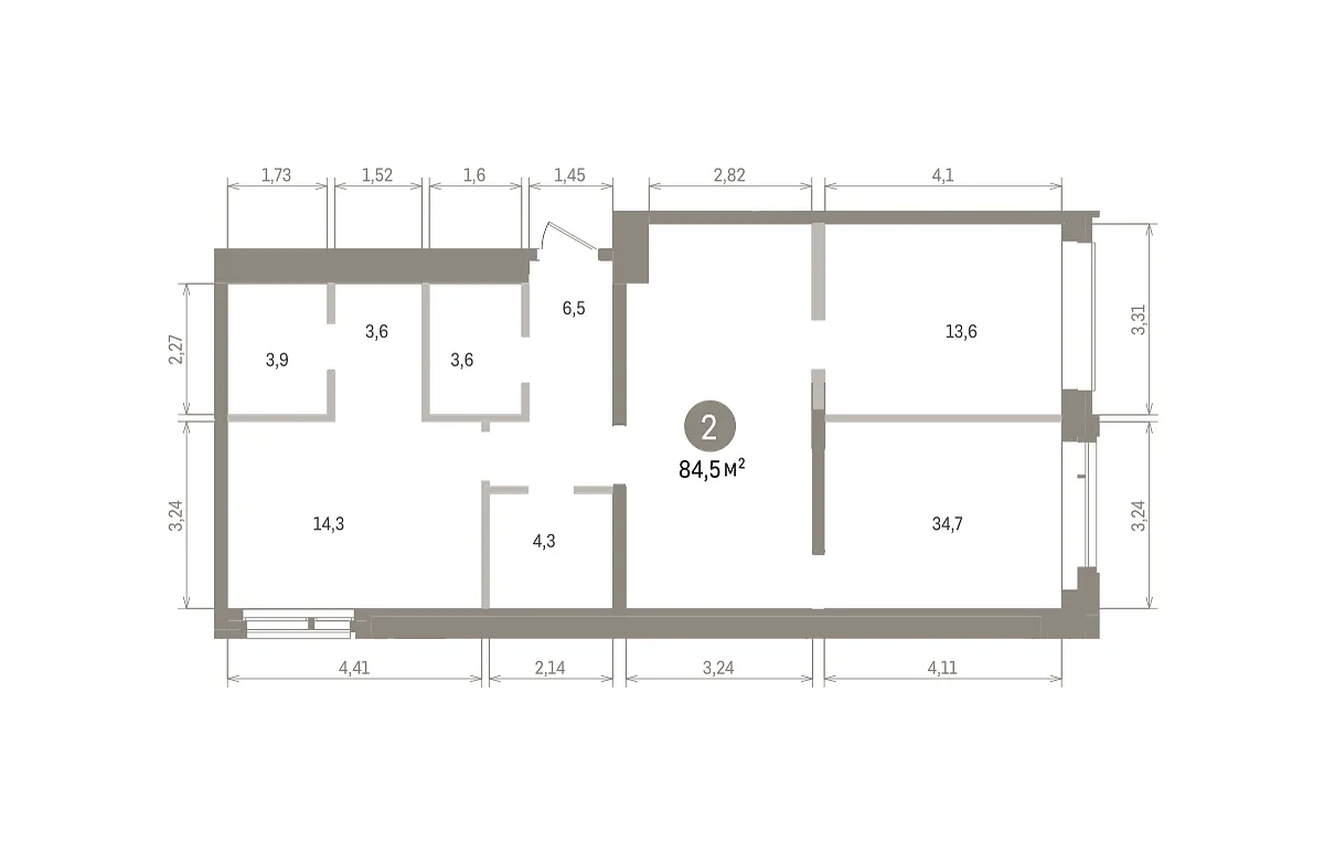 Площадь (общ/жил/кух), м2: 84.9/34.3/—