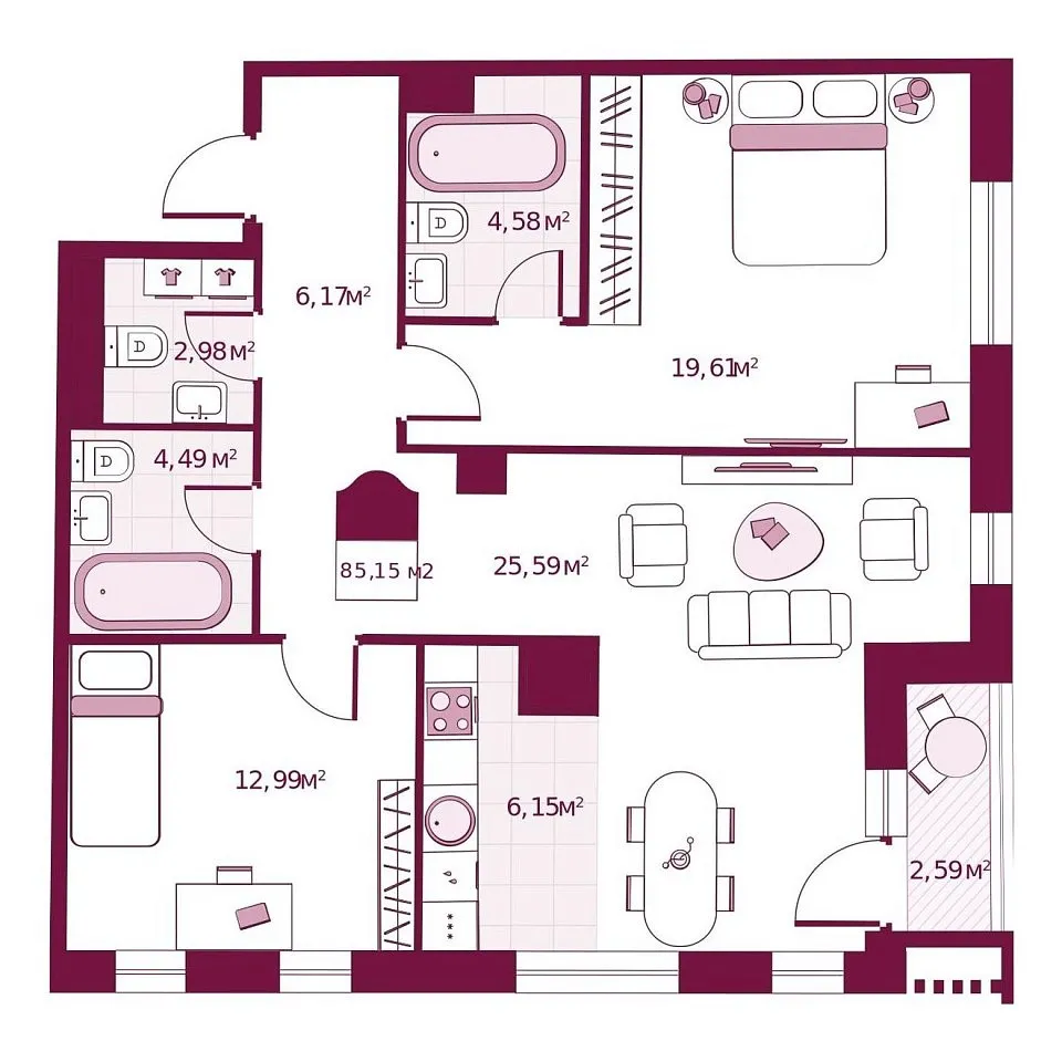 Количество комнат: 2, 85.15 кв.м.