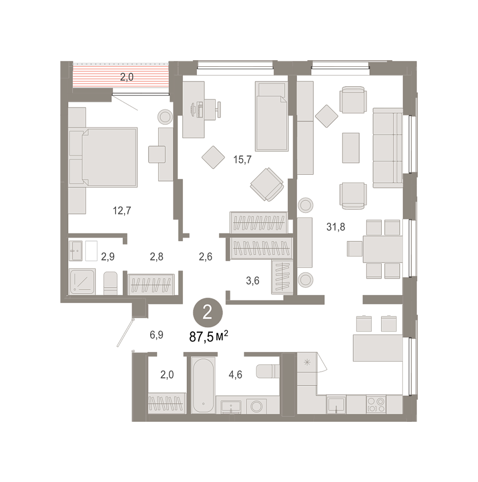 Количество комнат: 2, 87.54 кв.м.