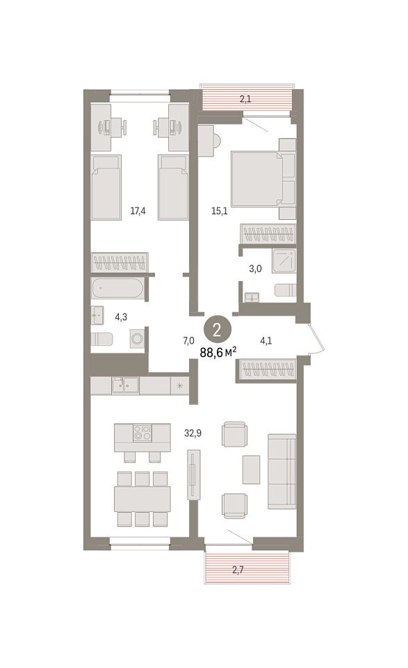 Количество комнат: 2, 88.6 кв.м.