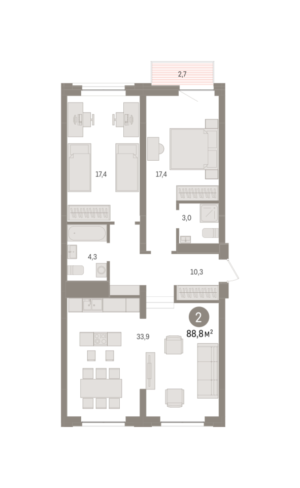 Количество комнат: 2, 88.8 кв.м.