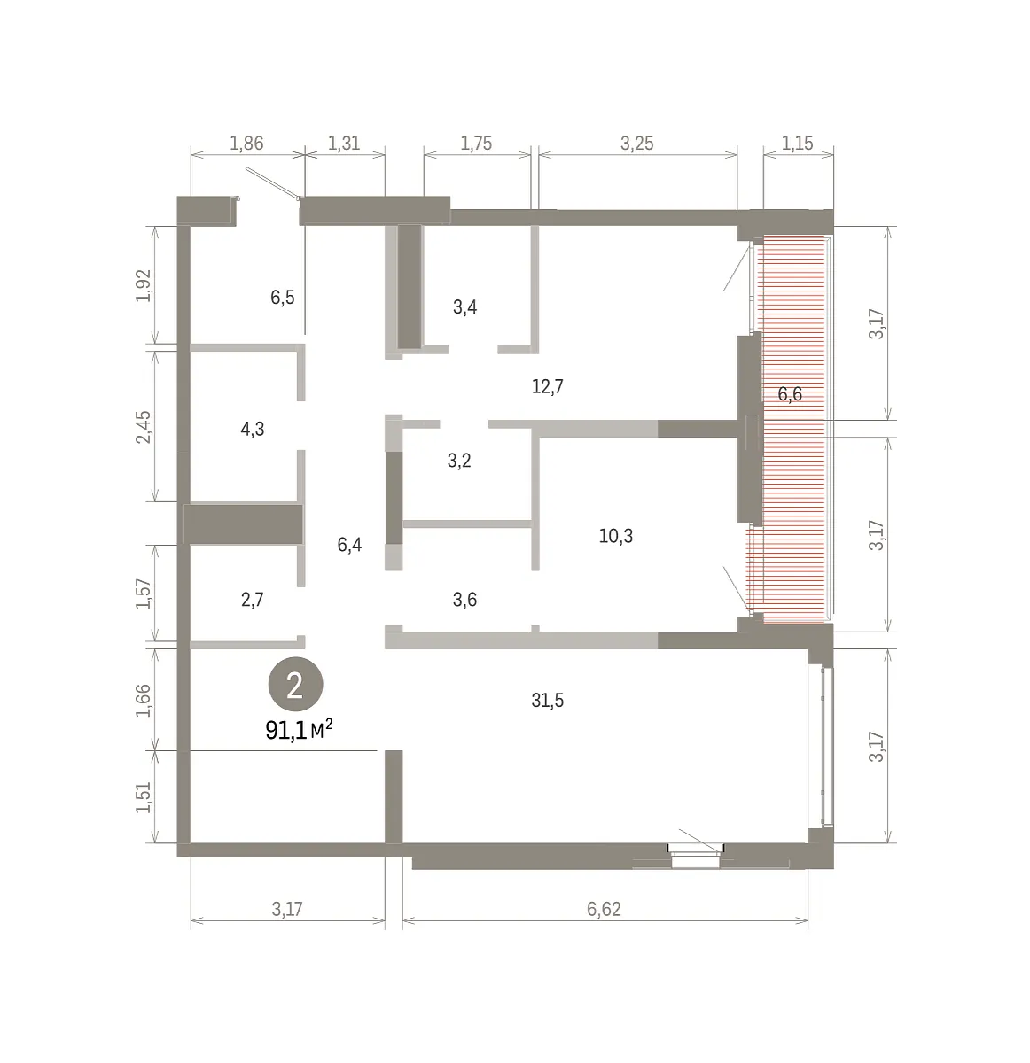 Количество комнат: 2, 91.08 кв.м.