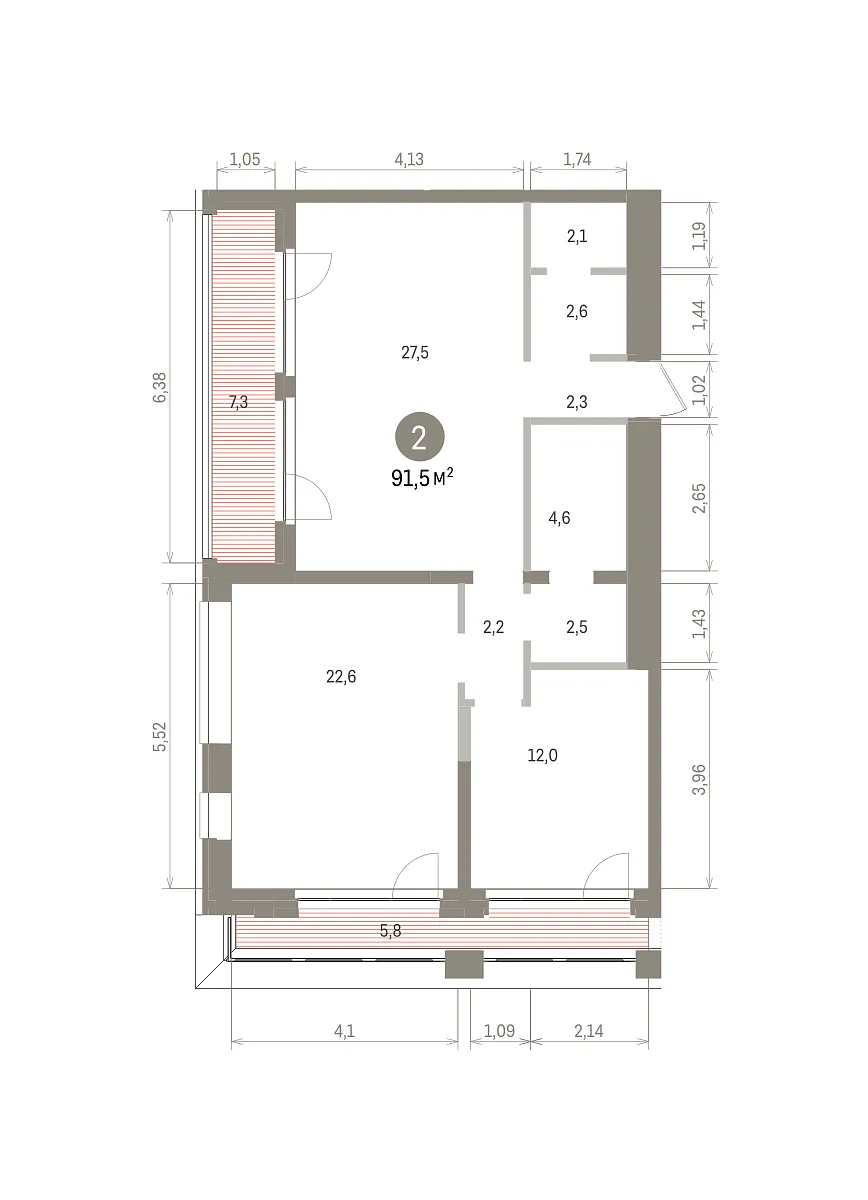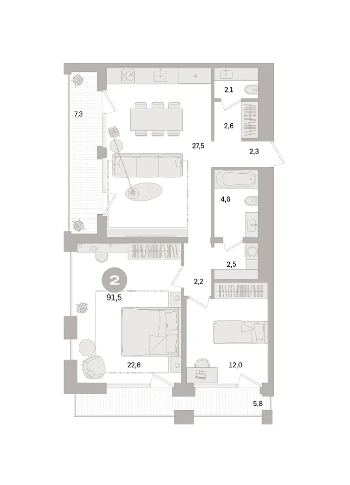 Количество комнат: 2, 91.5 кв.м.