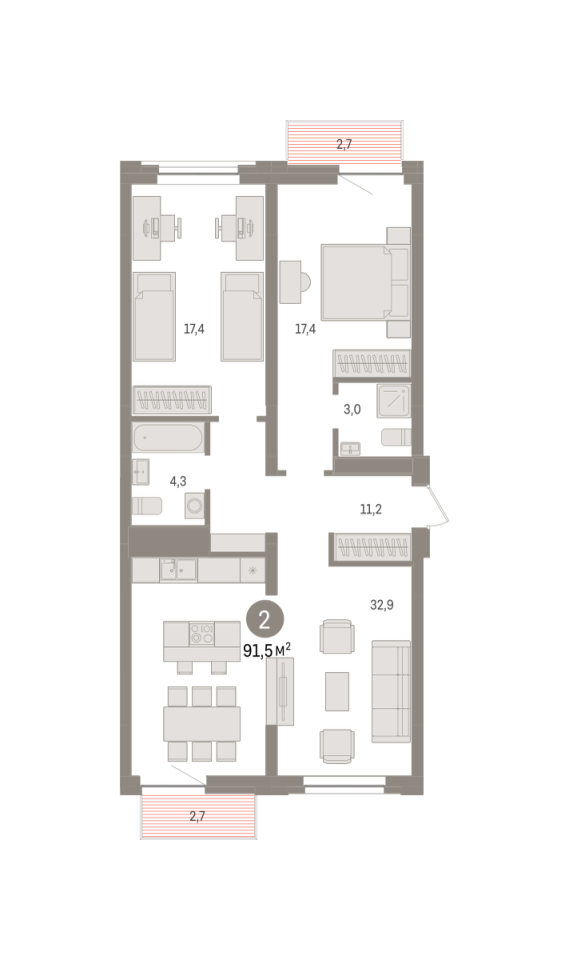 Количество комнат: 2, 91.6 кв.м.