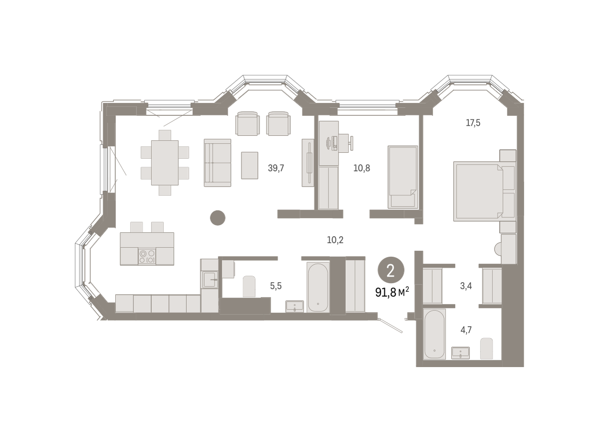 Площадь (общ/жил/кух), м2: 91.8/28.3/39.7