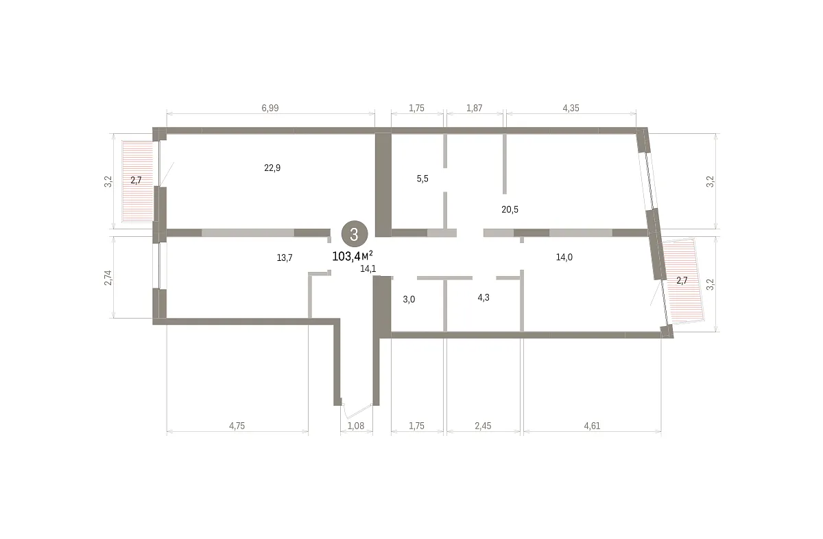 Площадь (общ/жил/кух), м2: 103.4/48.2/22.9