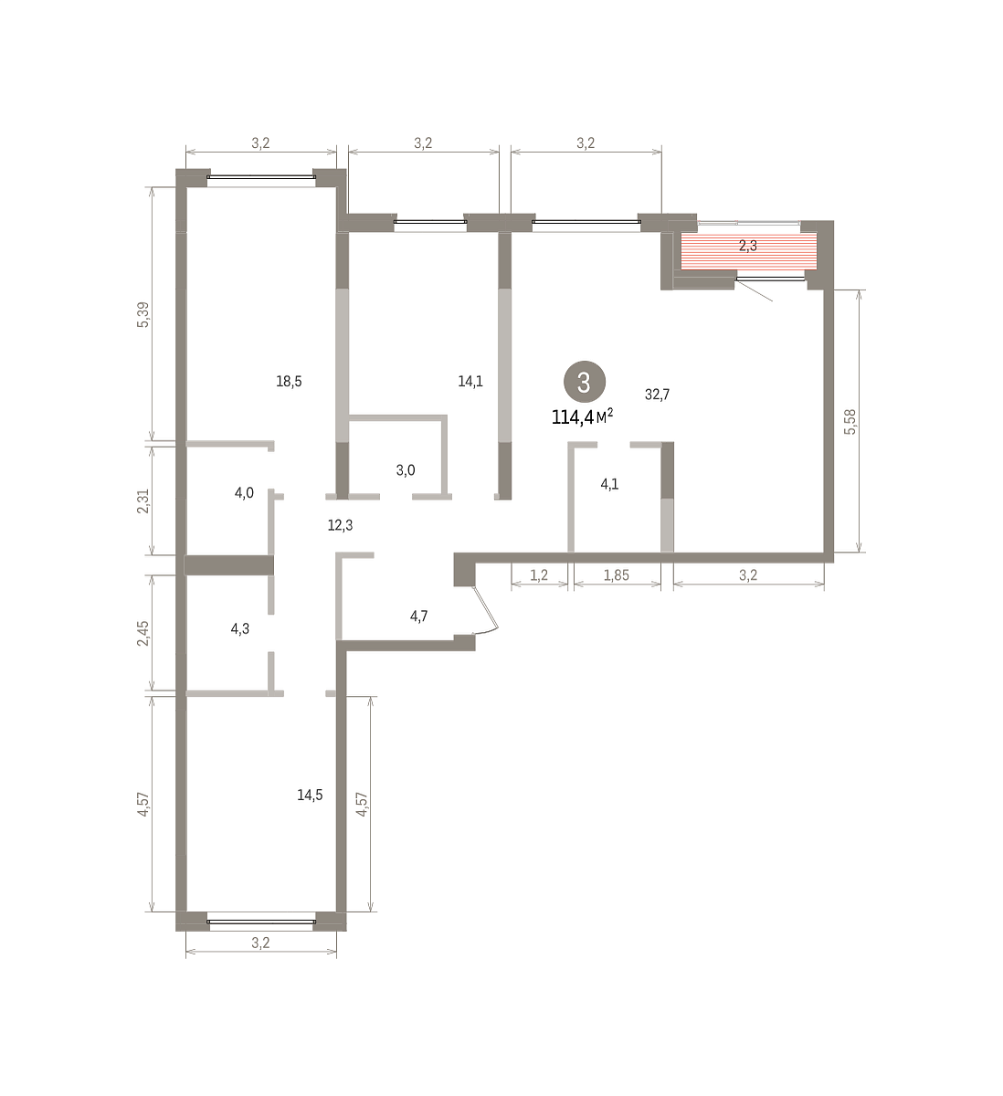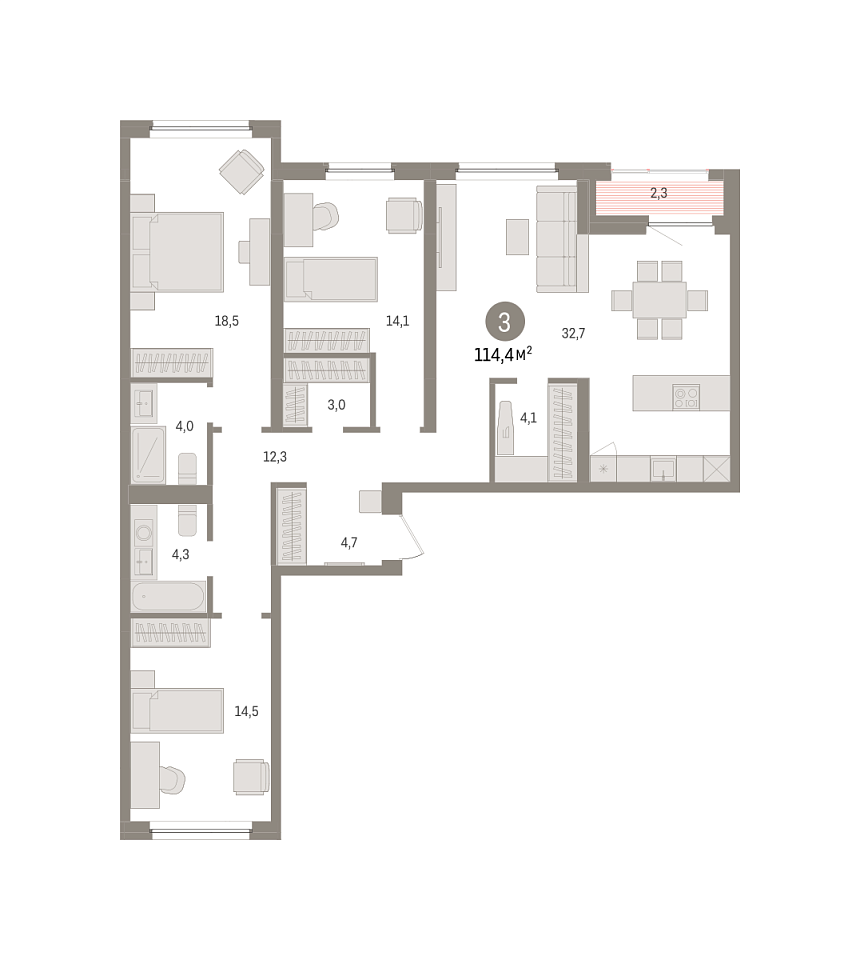 Количество комнат: 3, 114.43 кв.м.