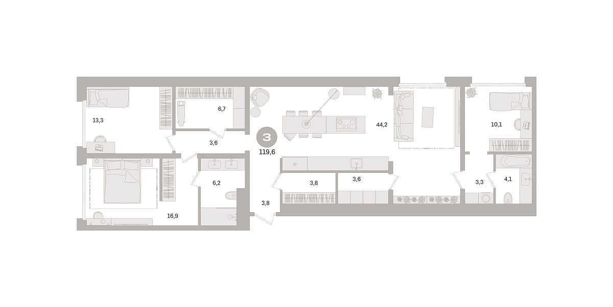 Площадь (общ/жил/кух), м2: 119.4/43.2/44.3