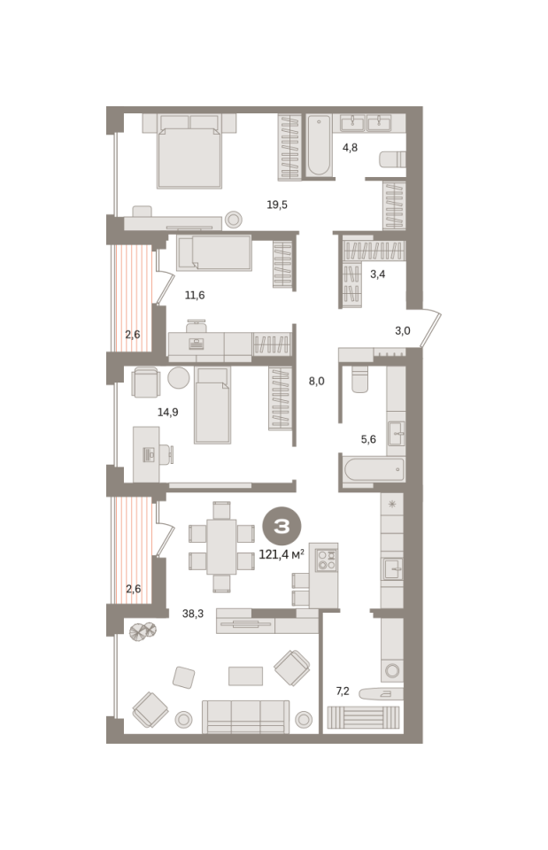 Площадь (общ/жил/кух), м2: 121.4/58.73/5.71
