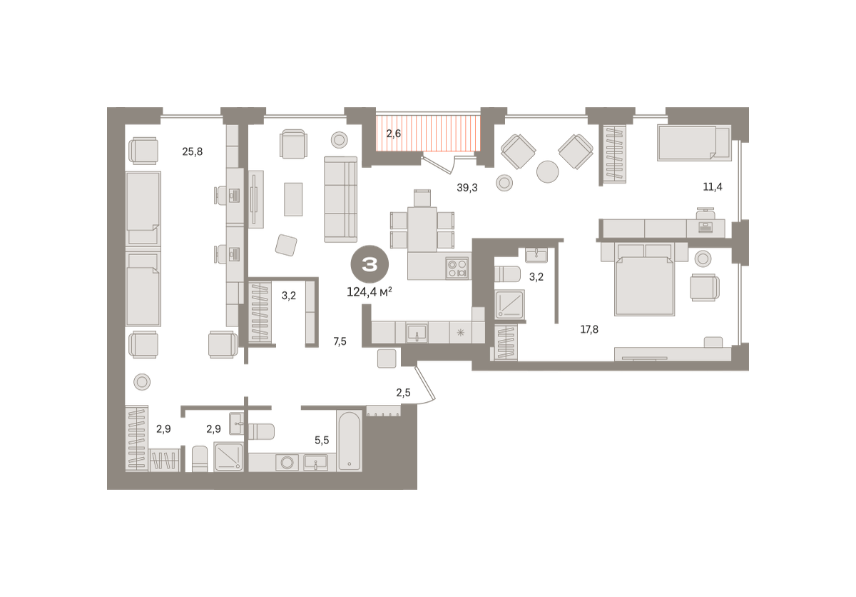 Площадь (общ/жил/кух), м2: 124.31/52.96/39.2