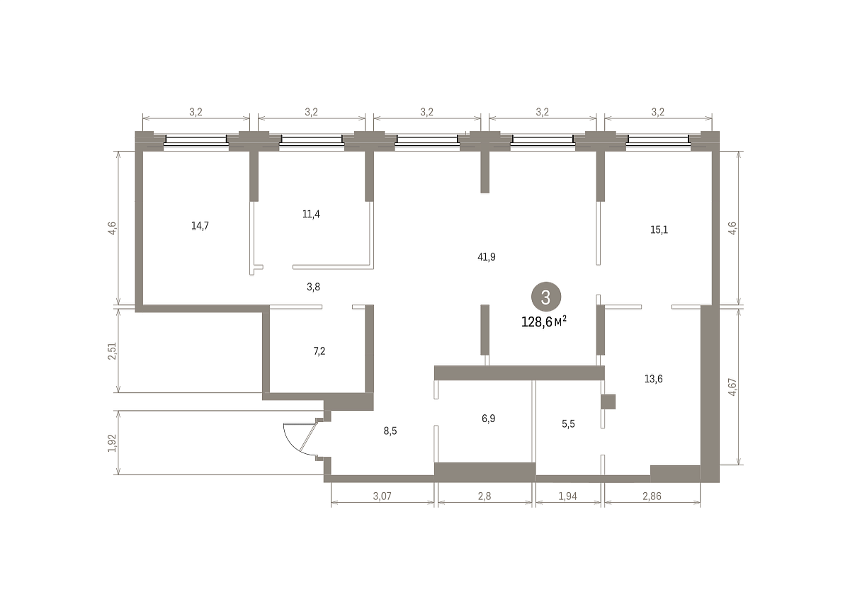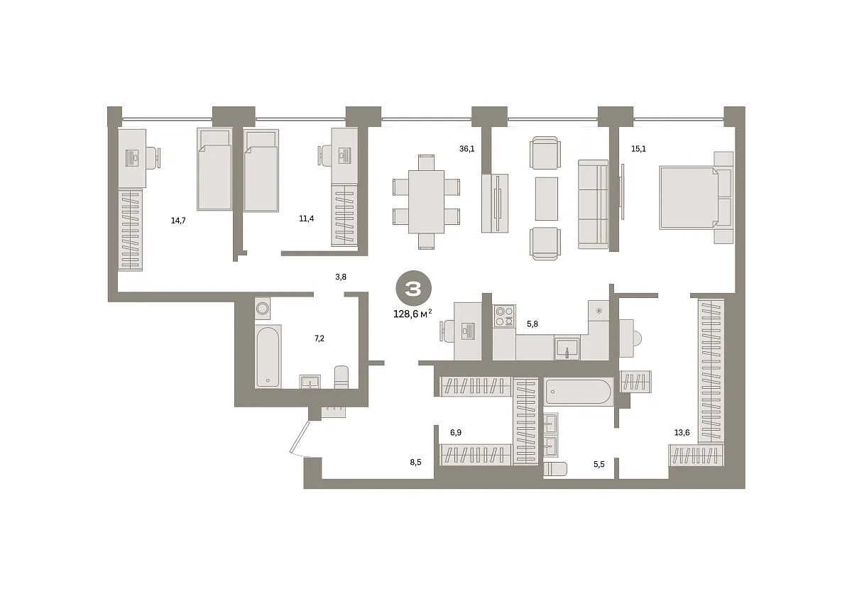 Количество комнат: 3, 128.6 кв.м.