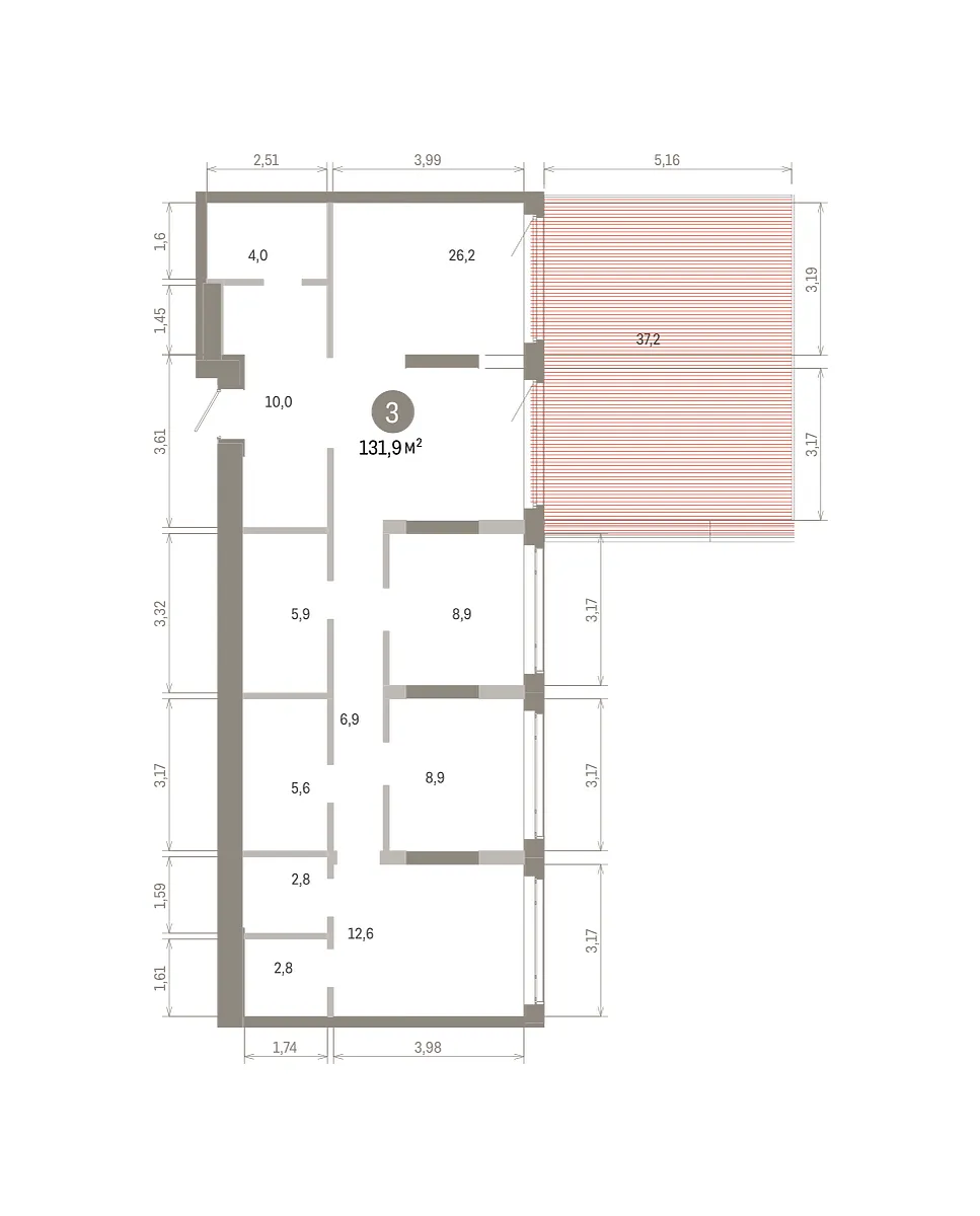 Площадь (общ/жил/кух), м2: 131.89/30.42/26.23