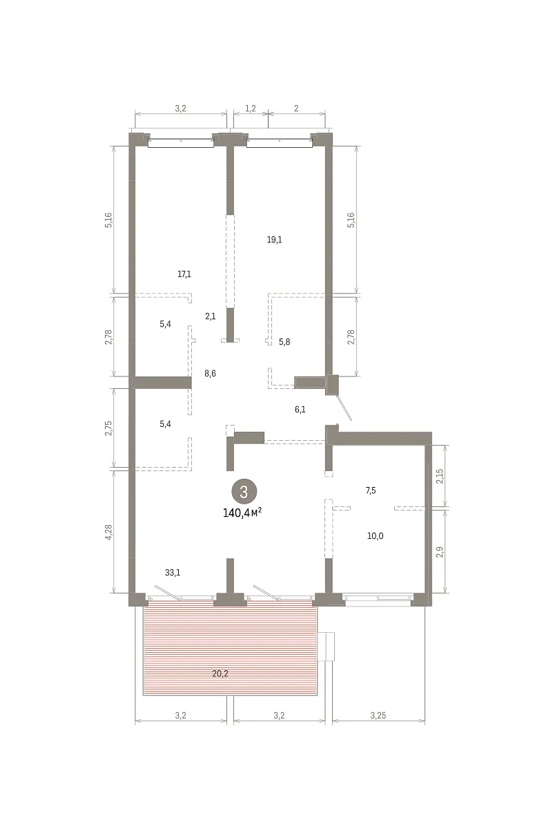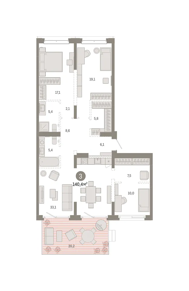 Количество комнат: 3, 140.38 кв.м.