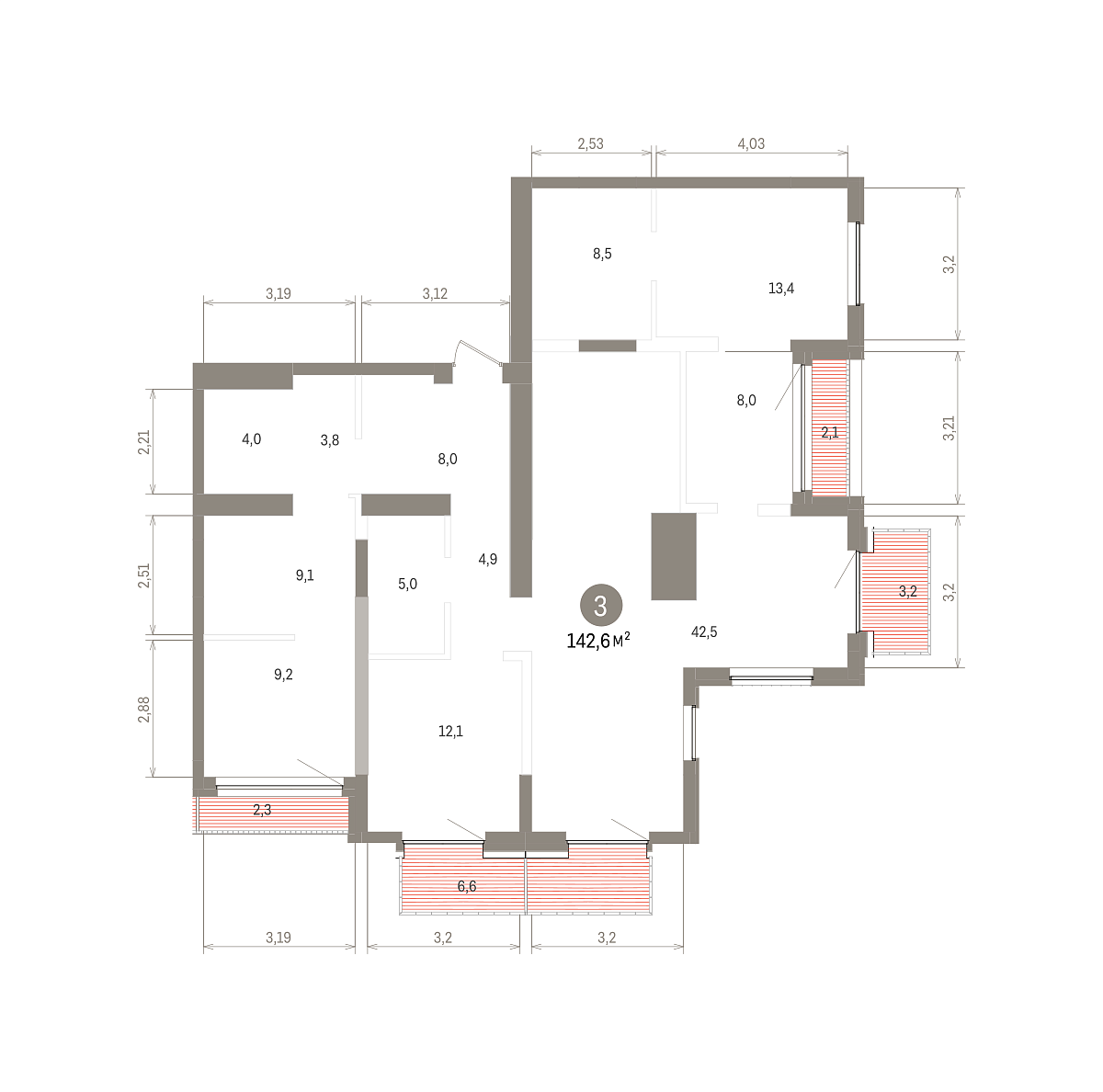 Площадь (общ/жил/кух), м2: 140.93/42.57/43.35
