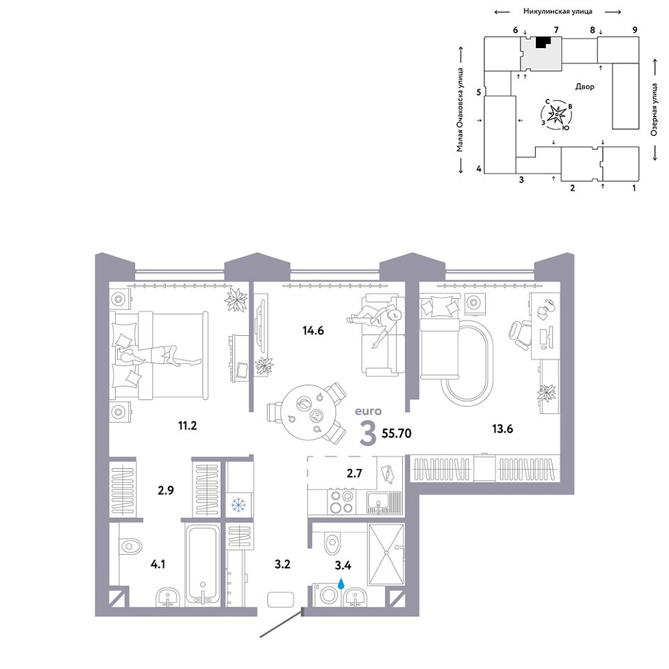 Площадь (общ/жил/кух), м2: 55.7/39.4/—