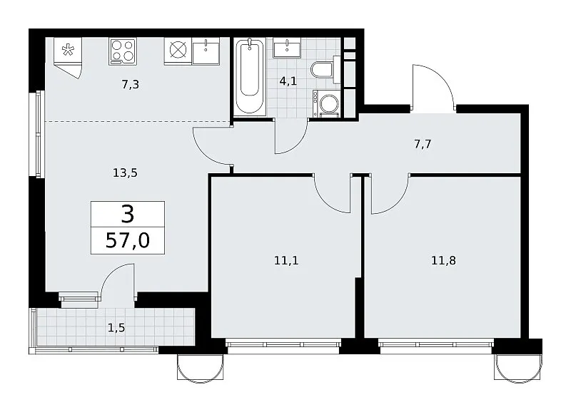 Количество комнат: 3, 57 кв.м.