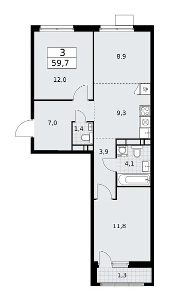 Количество комнат: 3, 59.7 кв.м.